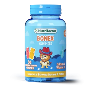 Nutrifactor Bonex Gummies provide Calcium, Vitamin D3, and Phosphorus to support strong bones and healthy teeth in a tasty chewable form for all ages.