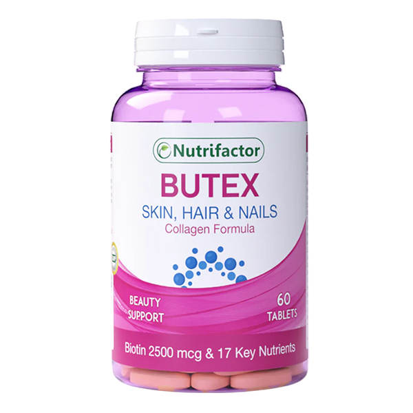 - Nutrifactorโs Butex has a blend of 17 vital vitamins and minerals along with collagen, which is just the right balance of nutrients to support beautiful hair, strong nails and vibrant skin. This peculiar formula contains essential nutrients to provide natural beauty from within.
