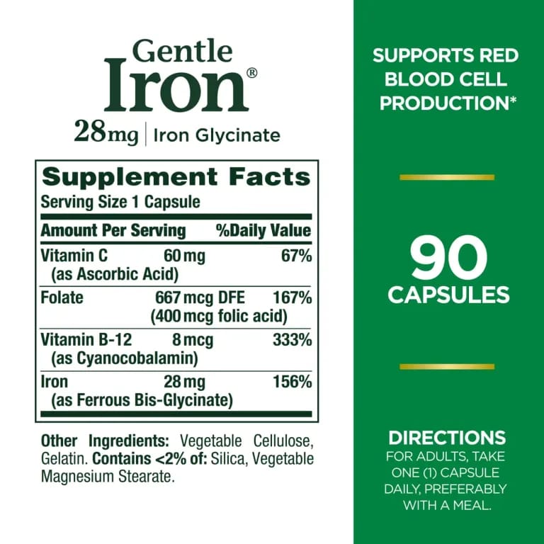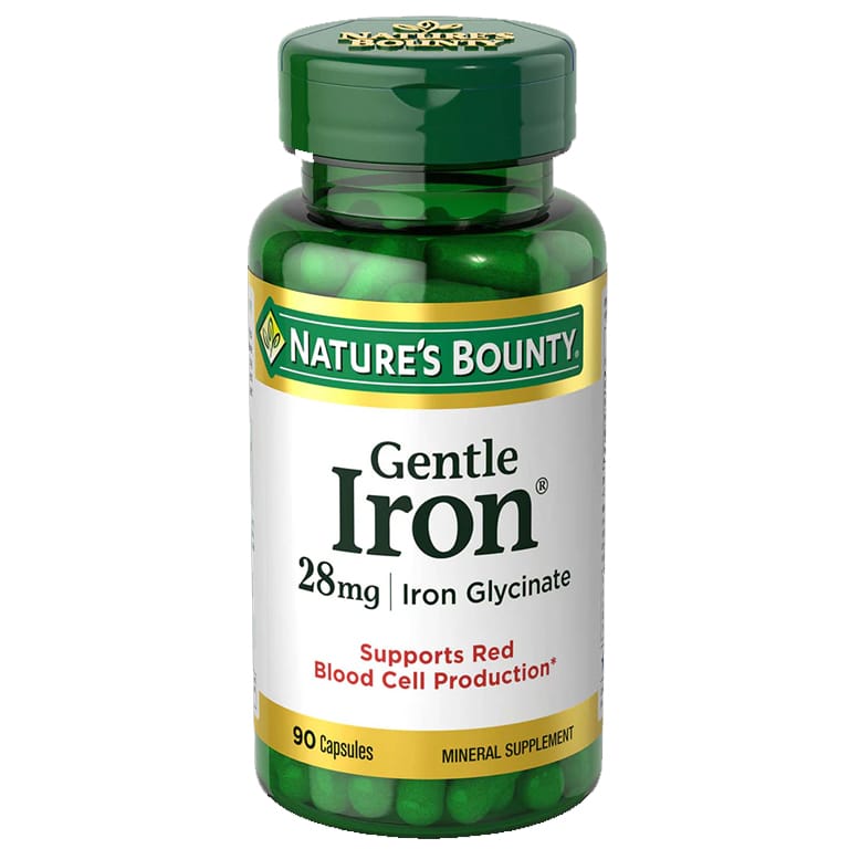 Nature’s Bounty Gentle Iron 28mg is a highly absorbable form of iron (as ferrous bisglycinate), specially formulated to be gentle on the stomach. It supports the formation of healthy red blood cells and helps maintain normal energy levels, especially useful for individuals with iron deficiency or increased iron needs.*