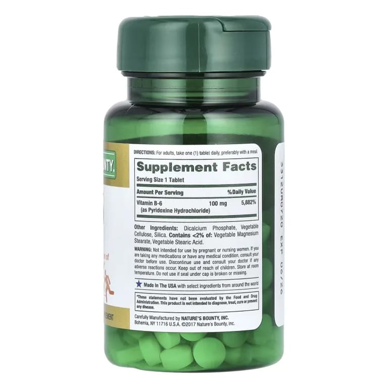 Nature’s Bounty Vitamin B6 100mg is a dietary supplement that provides a high-potency dose of Vitamin B6 to help support your daily nutritional intake. Vitamin B6 plays a role in various bodily functions and contributes to general health and wellness.