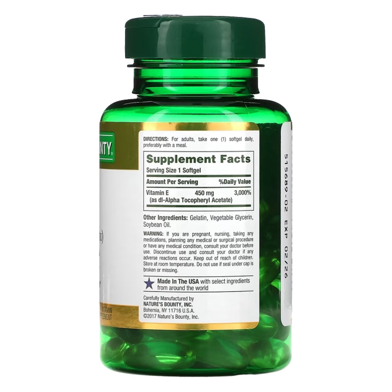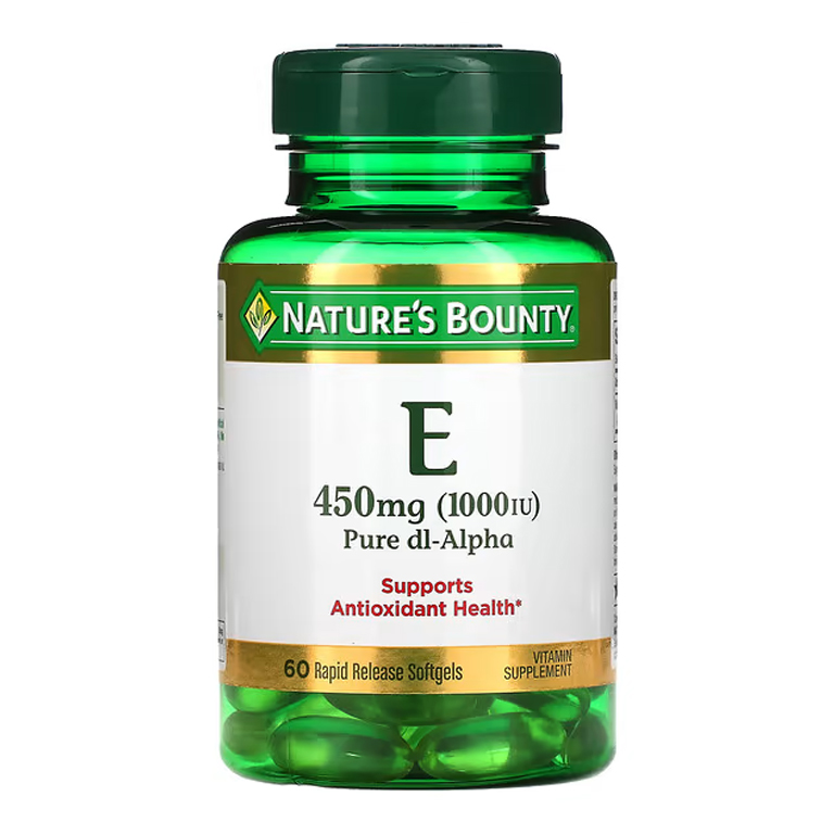 Nature’s Bounty® Vitamin E 450 mg (1000 IU) provides a potent dose of this essential nutrient, known for its antioxidant properties that help fight free radicals in the body.* Vitamin E also supports immune system health and plays a role in maintaining cardiovascular wellness.*