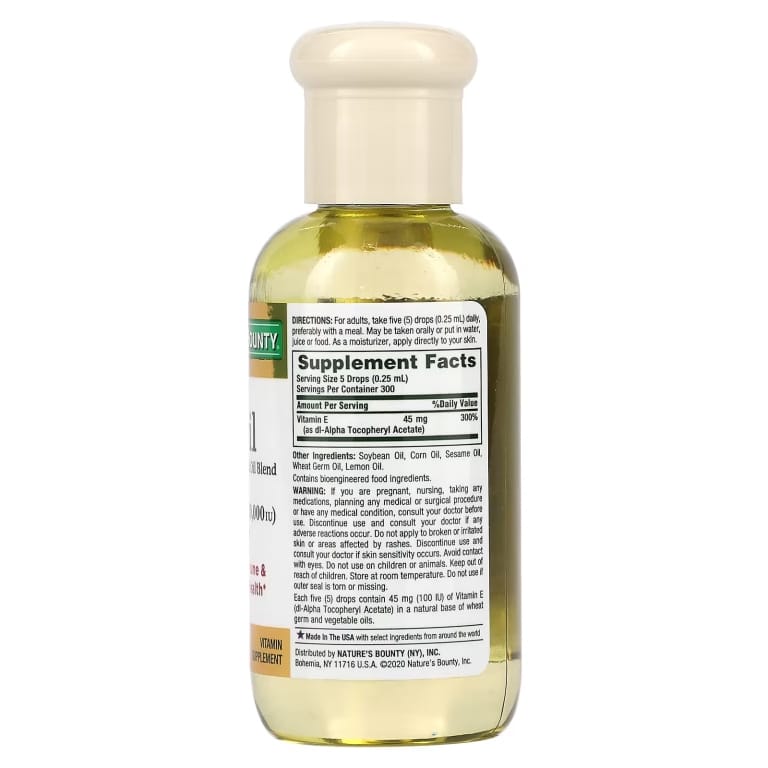 Nature’s Bounty® Vitamin E Oil provides 13,500 mg (30,000 IU) of Vitamin E per bottle, offering antioxidant support and aiding in immune function. This oil can be taken orally to contribute to overall wellness or applied topically to help maintain the skin’s natural moisture, promoting a smooth and radiant complexion. Its formulation is suitable for vegetarians and free from artificial colors, flavors, and sweeteners.