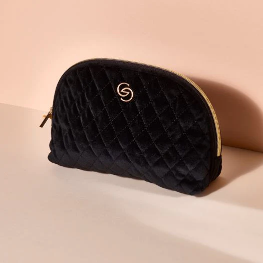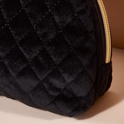 Elegant and sustainable: Giordani Gold’s quilted black velvet makeup pouch with gold‑embossed GG logo, double zip, and recycled velvet shell—luxury in every detail.